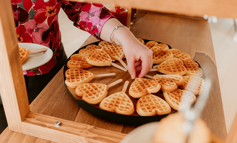 Schattige hartjes wafeltjes op een stokje die tijdens jouw feestje door je gasten worden afgewerkt naar eigen keuze met de sausjes en toppings. Er worden steeds 4 soorten sausjes en 5 soorten toppings voorzien.
